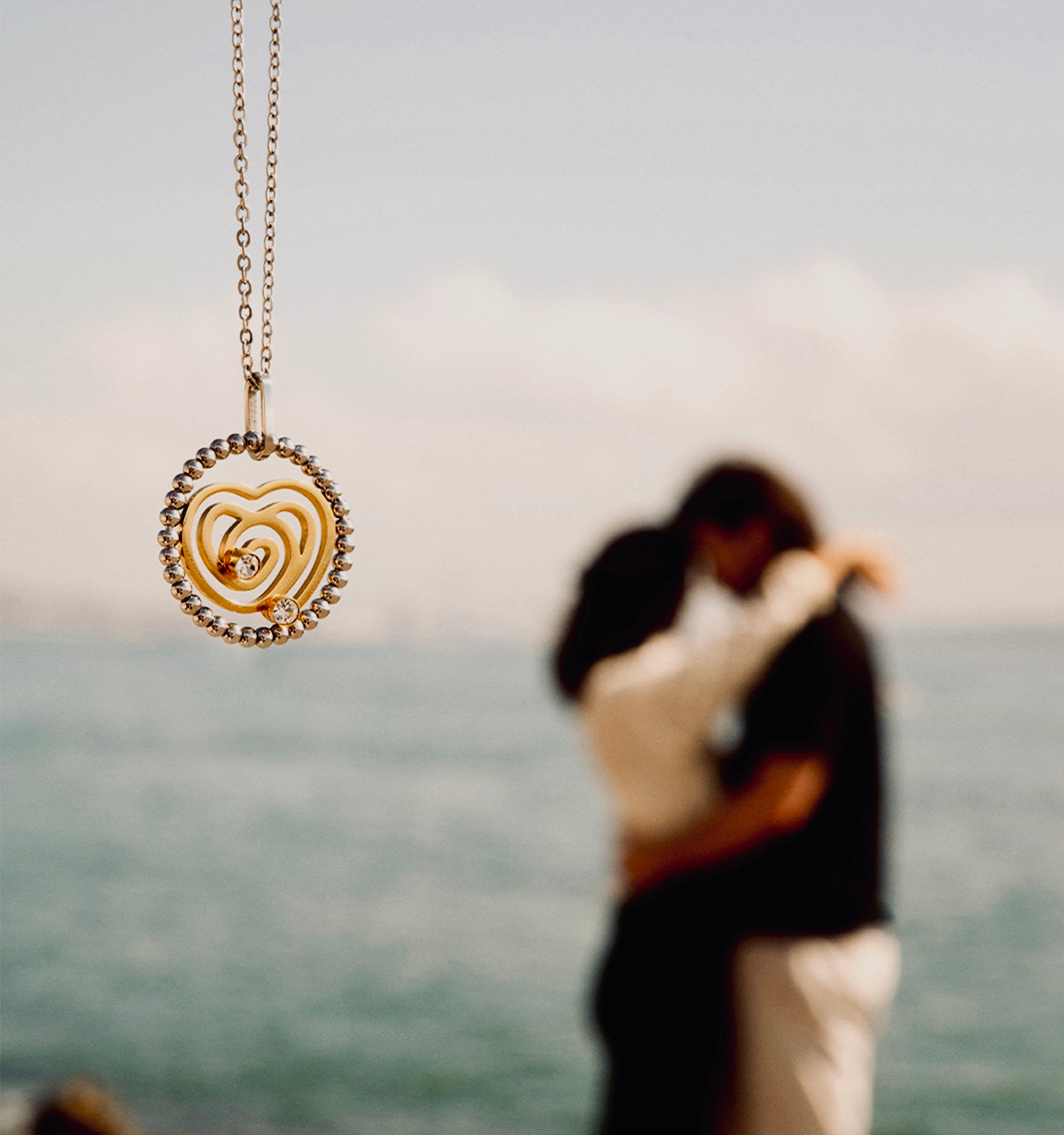 Existe sempre alguém, existe sempre um momento e existe sempre um lugar especial para ser feliz. O movimento dos cristais que deslizam no interior do pendente encontram-se — como dois destinos que se cruzam no tempo certo, no lugar certo.
